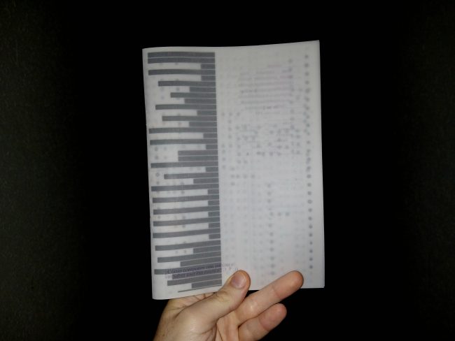 Algunos fanzines utilizan el papel vegetal para sus portadas con un fin protector o una primera pátina suave y atmosférica, como Huele a palomitas, de Carmen B Mikelarena. No así en la pieza de Iman. La translucidez es la condición base de toda su visibilidad, por igual en lo que hubiese sido la portada, la contraportada y la tripa. Sugiero que no se le puede aplicar esta división, o sólo con matices, y que la artista quería explorar esta ambivalencia, o desembocó en ella y lo vio bien. Desde el momento en que se tiene en la mano, ¿Cómo componer una partitura…? incita a una mirada de conjunto. Cualquier leve cambio en la presión que ejerzo para sostener el fanzine confiere o resta alcance a mi vista. A contraluz, se adivinan o desaparecen detalles de hasta diez hojas adelante. En la portada el título aparece abajo, muy pequeño, en morado apenas discernible, oculto por algo colocado tras él (las masas negras y rectangulares de la página 3[1]) y disimulado por el morado de los detalles de las páginas siguientes. Casi toda la contraportada la ocupa un texto que sintetiza con humor la premisa del fanzine, en el lugar donde iría una sinopsis, en degradado de morado a turquesa. En principio no aprecio rechazo a la convención de las cubiertas que presentan por delante e incitan por detrás, siguiendo una dinámica diferente a la de la tripa (la de la exposición de los hechos plásticos, textuales, etc). No obstante, la sustancia de las páginas, la subordinación del título y el tratamiento de la sinopsis indican que Iman pone a funcionar dichas convenciones al servicio de la dinámica de la tripa, que en el caso de ¿Cómo componer una partitura…? se trata de la exhibición y superposición de caracteres ASCII en diferentes estados: subrayados, tachados o formando frases, figuras y composiciones reticulares.