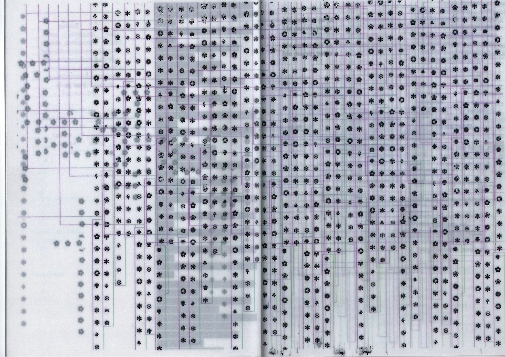 Todo ello me llevó a pensar que la serie fue redactada en origen como un renglón, de izquierda a derecha, y que luego la artista fue girando a placer cada serie que copiaba y pegaba. Examiné las páginas dedicadas a las retículas (de la 5 a la 15) y comprobé que la posición de la mayoría de los caracteres ASCII era la que se espera conforme se «plantan» sobre el documento, mientras que unos pocos sí habían sido girados, así que descarté mi presupuesto inicial. En el primer escenario hubiera bastado con ajustar la sangría al máximo para escribir en vertical. Pero, identificadas tantas estrategias (solapamientos, convivencia de series giradas en diversos grados, quiebres sutiles de las columnas), concluí que había sido necesario un potente procesador de texto y de imagen a la vez, que no limitase la escritura. La artista me confirmó que utilizó InDesign.
