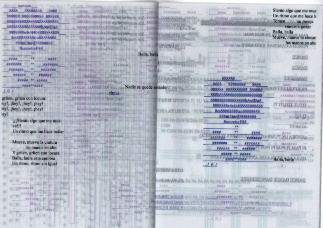Más adelante se van acumulando frases con congruencia sintáctica. Igualan en cantidad a las figuras y comparten con ellas su despliegue plástico. El fanzine está repleto de frases divertidas y enérgicas en relación a la música, como la transcripción improvisada de una bailarina vociferante. Esto se refleja en las repeticiones, la puntuación, el uso de apócopes (por ejemplo, el antes mencionado «pa’ cá» de la página 15); la onomatopeya (en las páginas 6, 7, 9 y 10); o el uso de las mayúsculas, que indican gritos y cambios en la entonación. Este enfoque del texto se intercala, y a veces se confunde, con lo que parecen letras de canciones. También se suman indicaciones sobre la lectura o el contexto del fanzine, como en las páginas 8, 9, 12 y 15. Sobre esto nos dice que le da «un sentido como de broma, como si fuera una propuesta de juego, para que otra persona pudiera hacer este tipo de ejercicios con otra música; incluso que se animaran a interpretarlo musicalmente. Así añado una cuestión burocrática, de examen. Es un intento naif de reírme de ella, uso su tipografía, su estructura…». Las maneras de abordar el texto varían según la posición del agente respecto del goce musical: según si lo está experimentando, si reflexiona sobre él o si lo está procurando para otros. Estos se contaminan entre sí. A través se suman imperfecciones y depósitos de tinta inesperados durante la impresión. Hilos como por bisturí, gotas delicadas, palabras desvanecidas y cuadritos primarios perfectamente coincidentes en horizontal: en la páginas 26 y 27, deslumbra la suerte de la artista, su humildad y su inteligencia al aceptar la belleza impredecible.