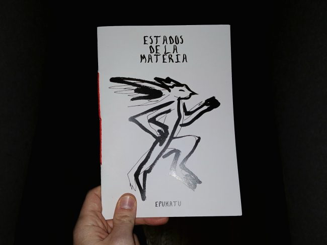 Cuando Epukatu habla del «incipiente personaje» de sus libretas, se refiere a la figura humana protagonista de Estados de la materia. Surgió durante su participación en un taller y aparece en todas las páginas salvo en la 4, la 5, la 8 y la 10. En el caso de la página 10, en realidad forma parte de ella, pues junto con la 11 acogen la misma imagen extensa y apaisada. El personaje, para el cual Epukatu no nos da ningún nombre, rebosa la clase de firmeza de quienes se toman en serio a partir de la conciencia de la pequeñez y vulnerabilidad de lo vivo. Una clase de tomarse en serio que en modo alguno excluye el humor. Uno muy sutil, no verbal, que se expresa en la sencillez y cercanía de la forma. De hecho, todos los escritos tienen un tono contundente e instructivo independiente de la óptica, más o menos optimista, a los que el personaje aporta una nota corporal que lo libera. La artista nos especifica que ha cambiado mucho: «antes dibujaba un personaje similar, pero que en vez de cara solo había un ojo grande y ahora, este personaje tiene ojos, nariz y pelo, pero no tiene boca». La ausencia de boca aporta cierta ambigüedad y contención al personaje. No se entiende como una falta, sino como algo que no le hace falta. «No tengo claro si es un alter ego, pero sí me permite pensar desde fuera de mí», explica. Este acercamiento al personaje como herramienta recuerda a las declaraciones de la artista Ebecho Muslimova, que plaga su trabajo plástico con su personaje, Fatebe: «Intento alcanzar ese lugar en el que solo importa la libertad de acción de este personaje. Cada dibujo es una posibilidad para el siguiente».[2] Al igual que Epukatu, Muslimova barajó la posibilidad de presentar a su personaje en trabajos plásticos más meditados cuando ya había acumulado una cantidad inmensa de dibujos, bocetos, apuntes y garabateos dispares de Fatebe. Hoy protagoniza libros recopilatorios y series de lienzos; acaso el personaje de Epukatu tenga la misma longevidad.